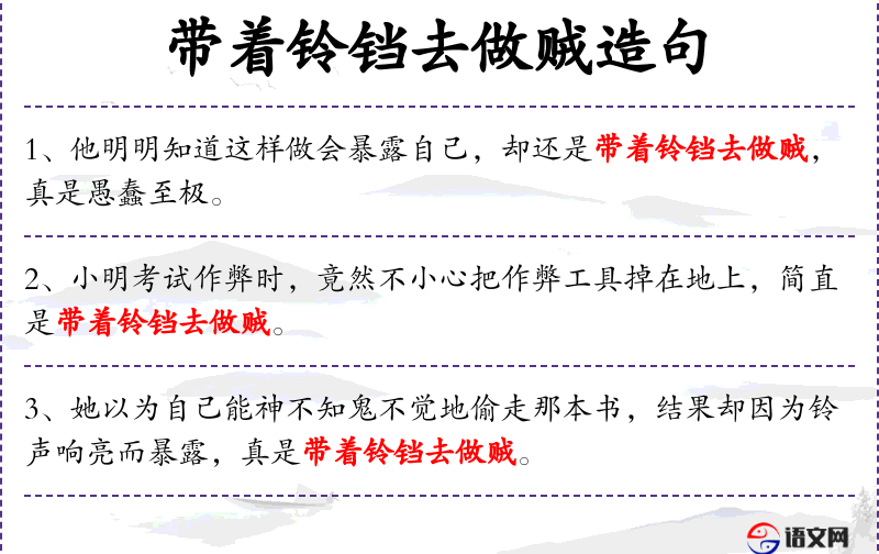 - 带着铃铛去做贼:成语,比喻做事不谨慎,容易暴露。