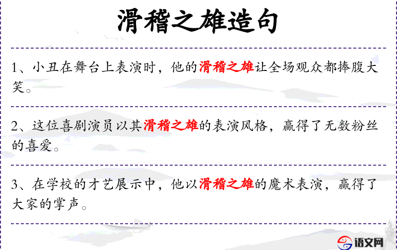 2. 【滑稽之雄】 滑稽:古代流酒器,专能注吐酒,后则用双比喻人能言善辩;雄:有杰出才能的人。旧时指诙谐善辩,口才超群的人。