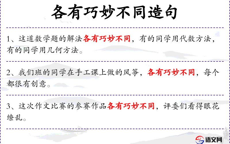 4. 【各有巧妙不同】 比喻为人做事像变戏法,各自有其灵巧奥妙的变化。