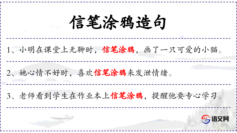 - 信笔涂鸦:随意书写或绘画,通常指不拘形式、自由创作。