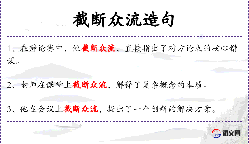 句子中的“截断众流”是一个比喻,源自**古代文学,意指在众多意见或事物中做出决断或总结。这个表达体现了中文中常用的比喻和修辞手法。