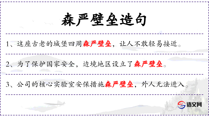2. 【森严壁垒】 森严:整齐,严肃;壁垒:古代军营四周的围墙。原指军事戒备严密。现也用来比喻彼此界限划得很分明。