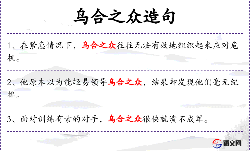 - 一群乌合之众:指一群无组织、无纪律的人,相当于英语的 "a motley crew" 或 "a disorganized group"。