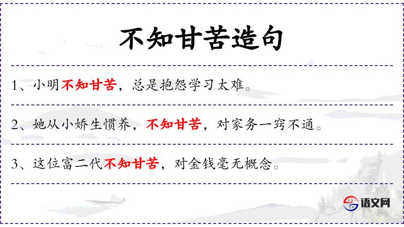 - 不知甘苦:不知道生活的艰辛和甜美,缺乏生活经验。