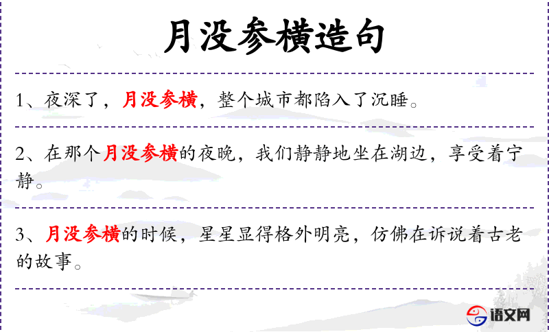 1. 【月没参横】 - 月亮已落,参星横斜。形容夜深。
