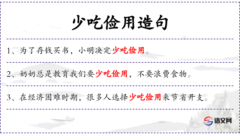 - 少吃俭用:成语,表示节约开支,减少不必要的消费。
