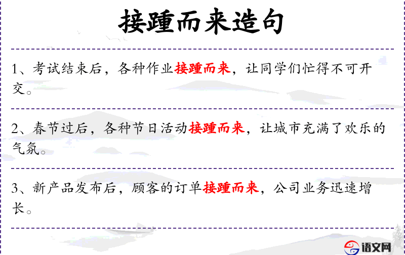 5. 【接踵而来】 指人们前脚跟着后脚,接连不断地来。形容来者很多,络绎不绝。
