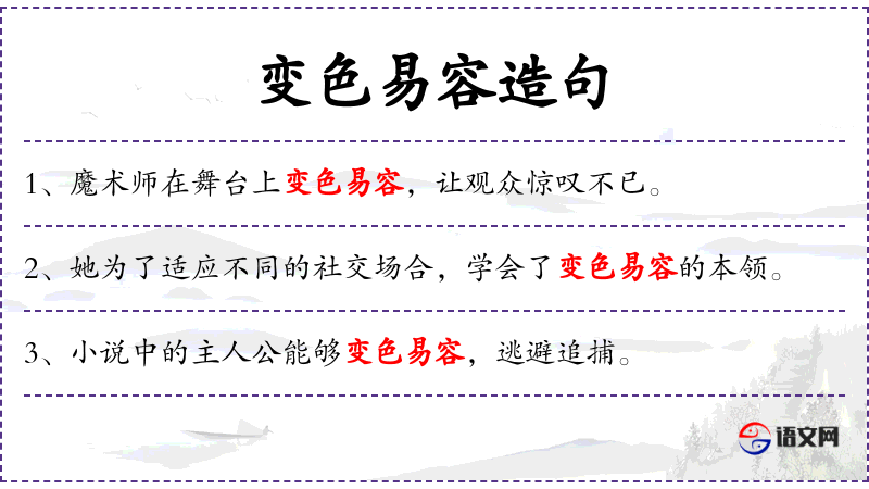 - 变色易容:动词短语,指改变外貌以伪装自己。