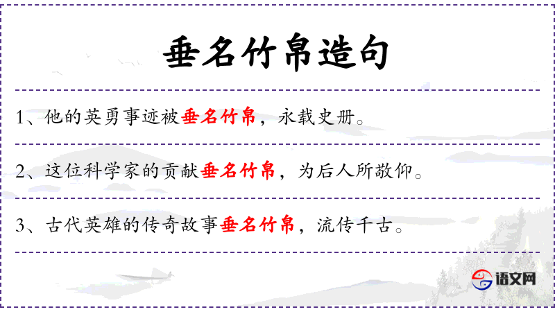 - 垂名竹帛:这个成语源自**古代,竹帛是古代的书写材料,意味着某人的名字和事迹被永久记录在历史中。
