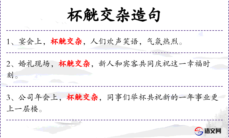 1. 【杯觥交杂】 - 觥:酒器;交:交织。形容酒宴中相互频频举杯畅饮的热烈气氛。