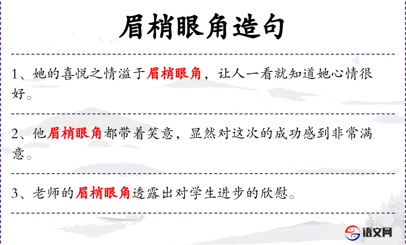 4. 【眉梢眼角】 - 眉梢:眉毛的末尾部分;眼角:上下眼睑的接合处。形容眉眼含情示意的神态。