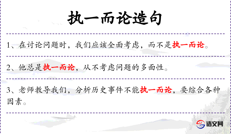 3. 【执一而论】 执:抓住;论:评论。抓住一点或一个方面进行评论。形容看问题片面。