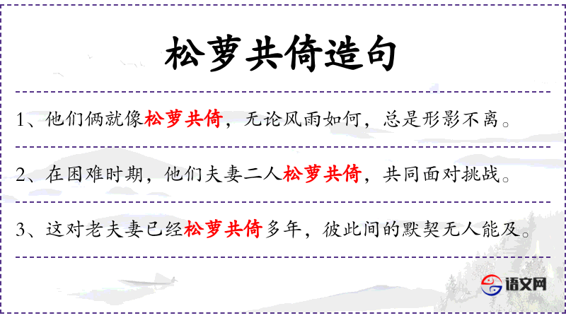 4. 【松萝共倚】 萝:寄生于松树上的能爬蔓的植物;倚:靠着。像松与萝那样相互依存。比喻夫妇和睦融洽。