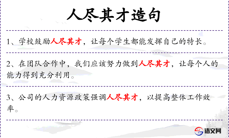 - 成语:人尽其才,强调每个人都有其独特价值和能力。