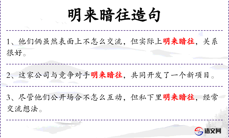 句子中“明来暗往”是一个成语,源自**古代的交往方式,形容表面上不交往,但私下里仍有联系。这个成语反映了中华文化中对表面与实际行为差异的观察和评价。