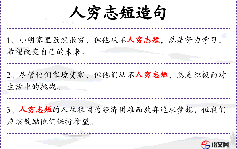 句子中“人穷志短”反映了社会对贫困和意志关系的普遍看法,强调了在逆境中保持积极心态的重要性。