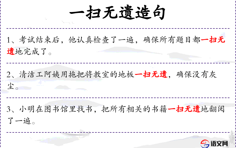 1. 【一扫无遗】 一下子便扫除干净。比喻彻底清除干净。