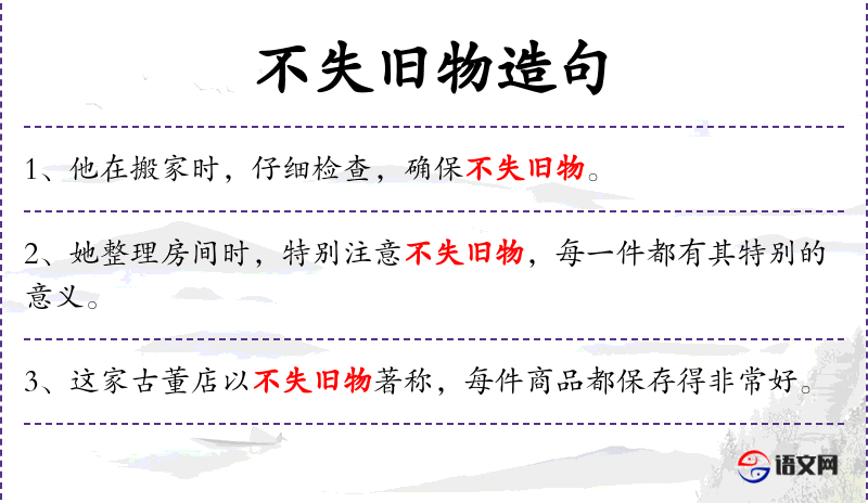 - 不失旧物:保持物品的原有状态,不使其损坏。相关词汇:保存、维护、修复。