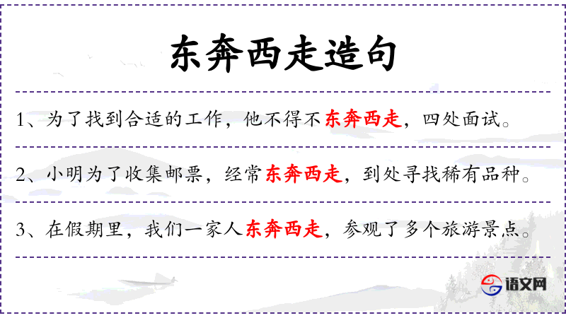 - 相关成语:“东奔西走”可以与“忙忙碌碌”或“四处奔波”等成语联系起来。