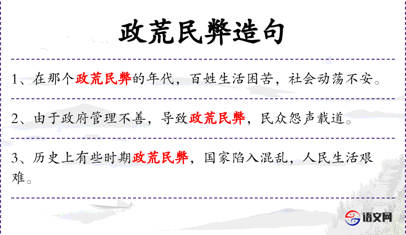 - 成语、典故:“政荒民弊”可以联想到“民不聊生”、“乱世出英雄”等成语。
