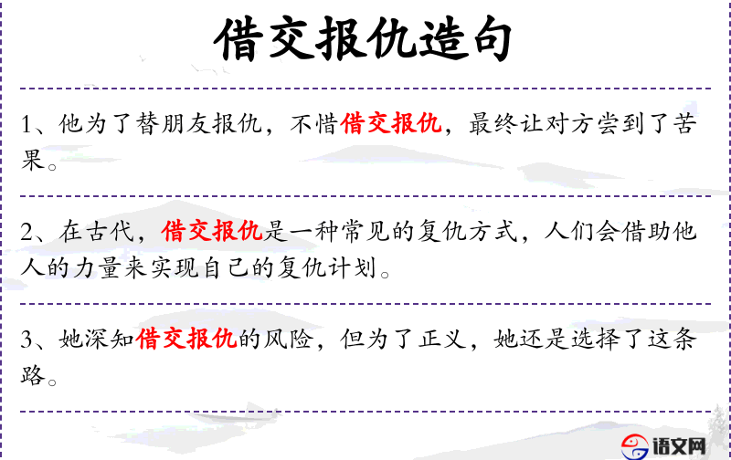 - 谓语:借交报仇、传为佳话、称赞