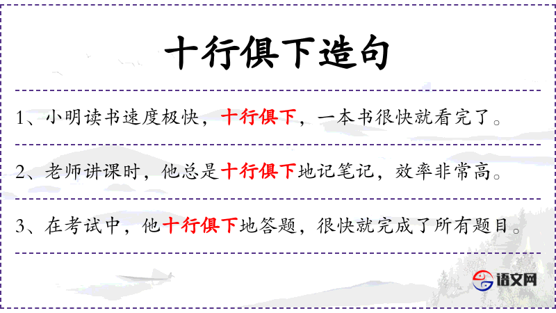 - 十行俱下:成语,形容阅读速度极快,一眼就能看多行。