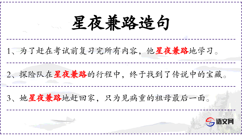 - 星夜兼路地:形容词短语,表示在夜晚连夜赶路。