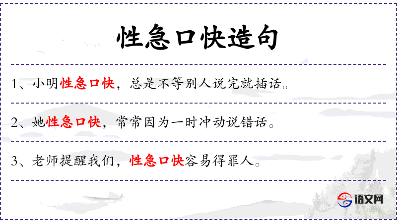 - 性急口快:形容一个人性格急躁,说话直率,不加思索。