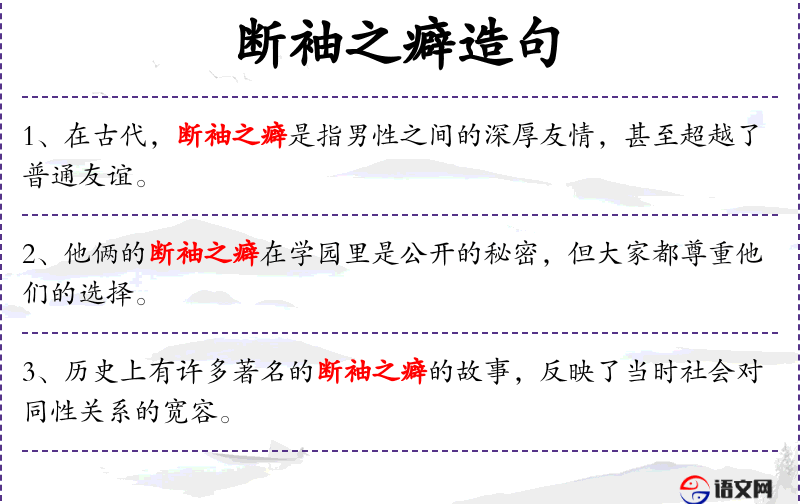 - 断袖之癖作为一个成语,反映了古代**对同性恋关系的一种特殊文化认知。