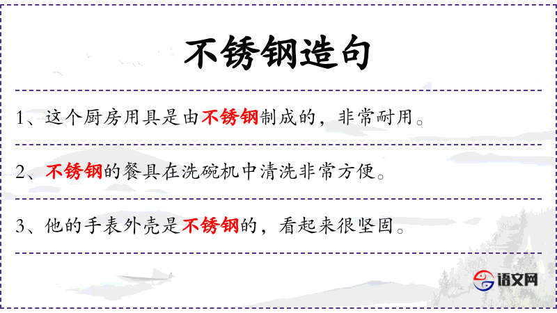 1. 【不锈钢】 - 含铬或含镍﹑钛等元素的合金钢。具有耐蚀和不锈的特性。多用来制造化工机件﹑耐热的机械零件﹑餐具等。