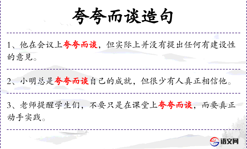 - 夸夸而谈:成语,形容说话浮夸,不切实际。
