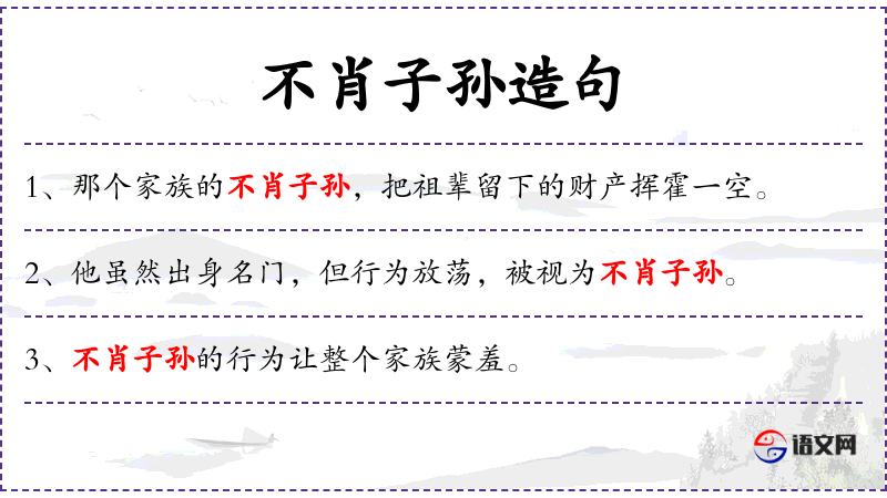 1. 【不肖子孙】 - 不肖:不象,不贤。指品德差,没出息,不能继承先辈事业的子孙或晚辈。
