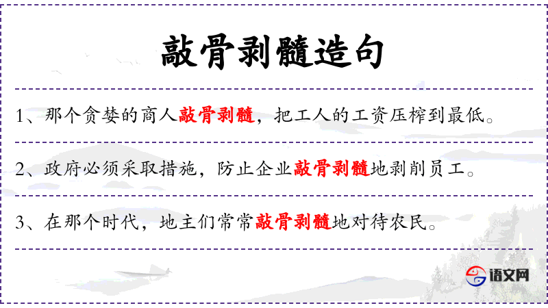 “敲骨剥髓”这个成语源自**古代,形容极其残酷或严苛的行为。在现代社会,这个成语常用于形容某些政策或条件的极端严苛性。了解这个成语的背景可以帮助更好地理解句子的文化内涵。