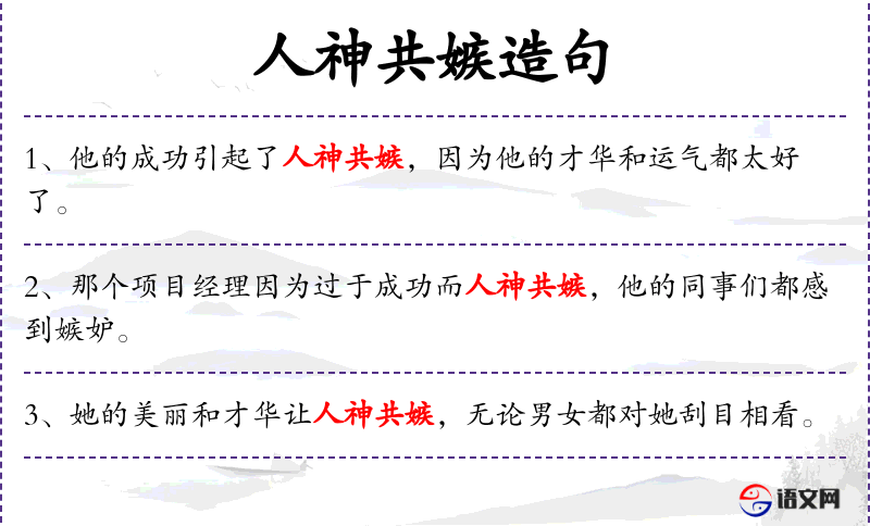 - 人神共嫉:形容某人非常成功,以至于人和神都嫉妒。