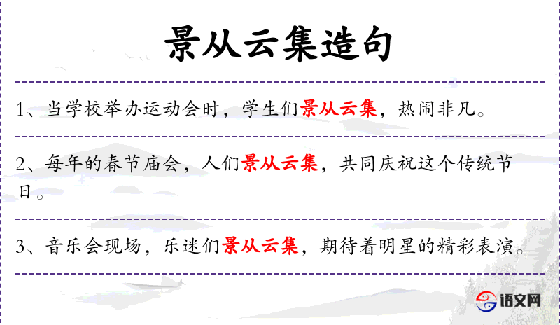 2. 【景从云集】 - 景:同“影”。如影随形,如云聚集。形容很快聚集了许多追逐者
