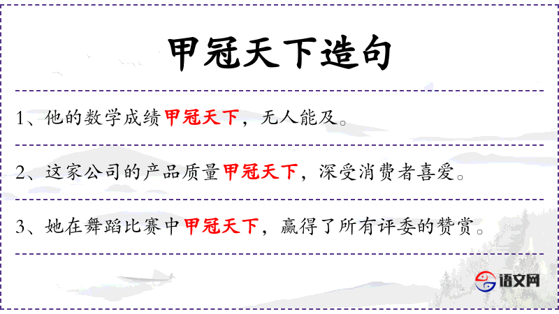 3. 【甲冠天下】 - 甲冠:第一。称雄天下。形容人或事物十分突出,无与伦比。