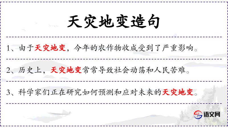 - 天灾地变带来的影响:英文中为“the impacts of natural disasters and geological changes”,日文中为“自然災害や地質変動の影響”,德文中为“die Auswirkungen von Naturkatastrophen und geologischen Veränderungen”。