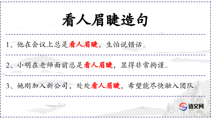 4. 【看人眉睫】 - 睫:眼睑边缘上生的细毛。比喻看人脸色。