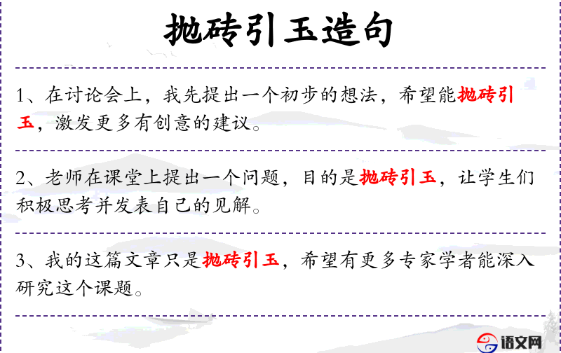 - 文化背景:在**文化中,“抛砖引玉”是一个常用的成语,体现了谦虚和鼓励他人参与的传统美德。