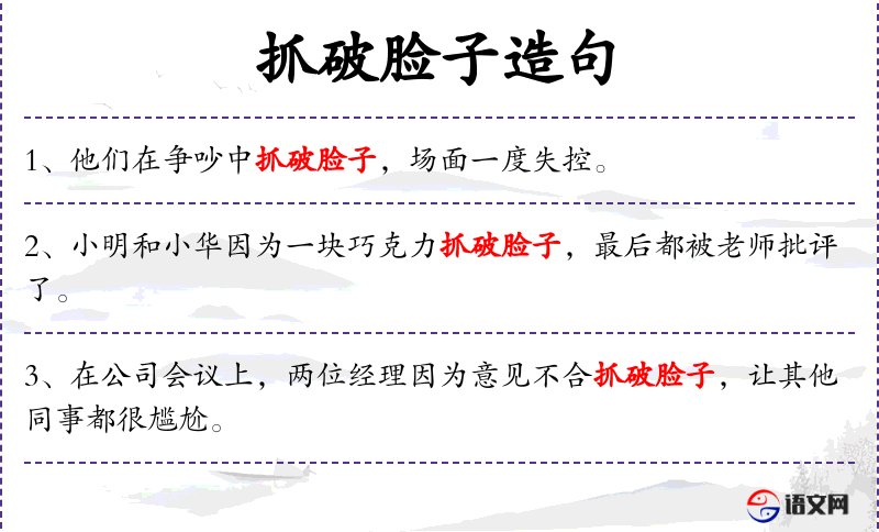 - 礼貌用语:句子中的“抓破脸子”带有贬义,暗示了不礼貌的行为。