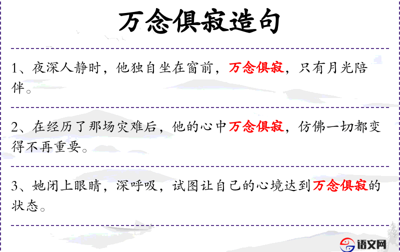 - 万念俱寂:all thoughts quieted, mind at peace