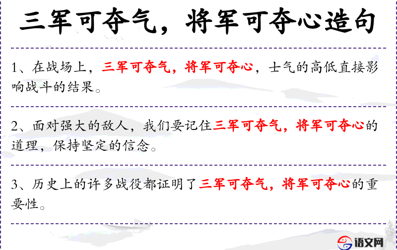 - 不同句式:在遭遇挑战时,我们应铭记“三军可夺气,将军可夺心”的智慧,坚定地保持冷静与决心。