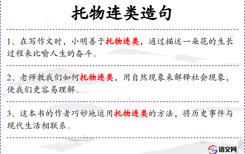 - 托物连类:通过具体事物来引申或比喻其他事物。