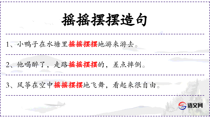 - 摇摇摆摆:形容动作不稳,左右摇晃的样子。