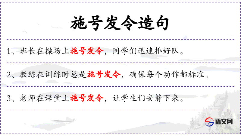 - 不同句式:“在战场上,指挥官通过施号发令,确保部队行动有序。”