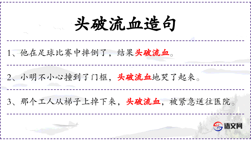 - 头破流血:短语,形容头部受伤并流血。
