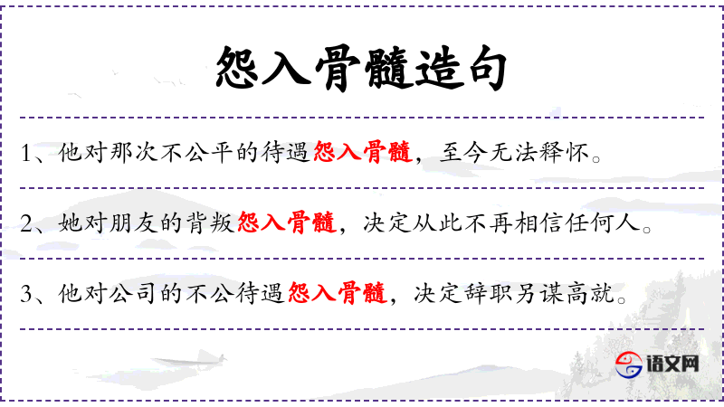 - 怨入骨髓:形容怨恨极深,深入骨髓。