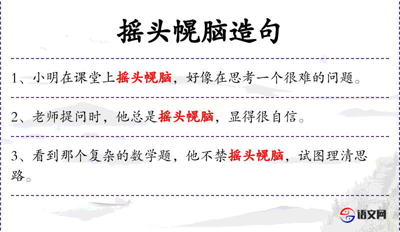 句子:“[看到那个复杂的数学题,他不禁摇头幌脑,试图理清思路。]”