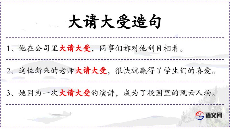 - 大请大受:这个词组可能是一个成语,意指非常受欢迎或受到高度评价。