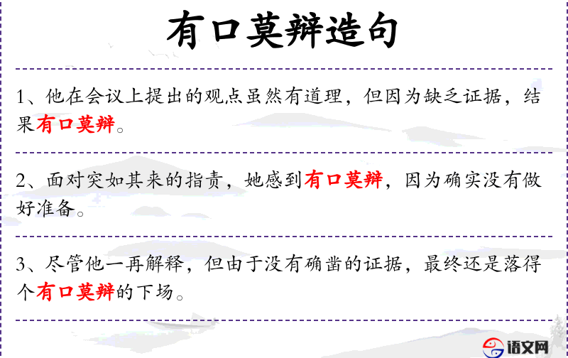 4. 【有口莫辩】 虽然有嘴却不能分辨。指有冤难伸,或内情曲折复杂,难以说清楚。